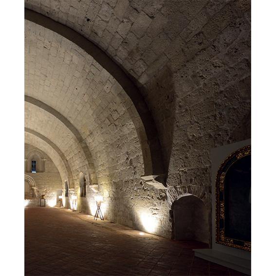 | Candeeiro de parede Dodo, com um ângulo de abertura mais fechado em cima e mais aberto em baixo. | Projetor Focus, cujo feixe de luz mais direcionado cria um efeito que permite isolar e destacar objetos ou áreas | Iluminação de uma galeria recorrendo a vários spots de encastrar em pavimento Trond |
