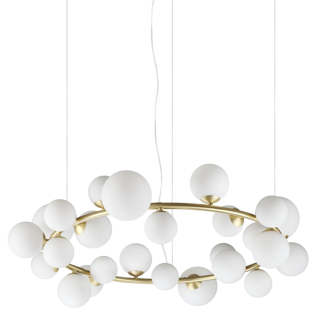 | Descrição | Candeeiro suspenso com estrutura circular em metal e globos em vidro. |