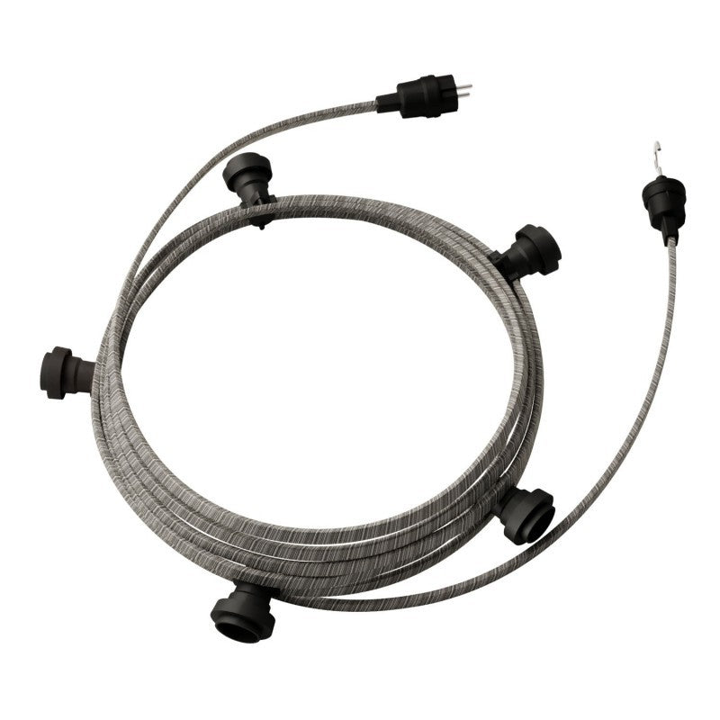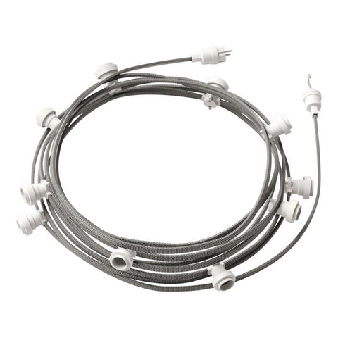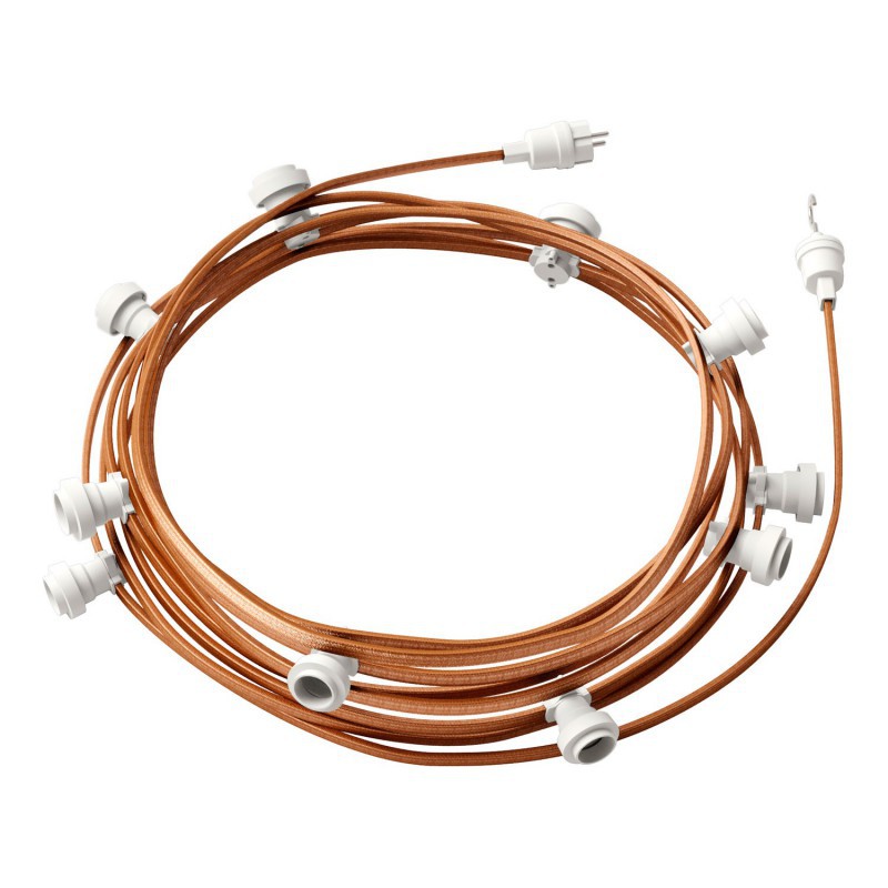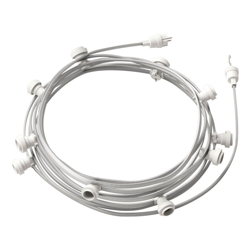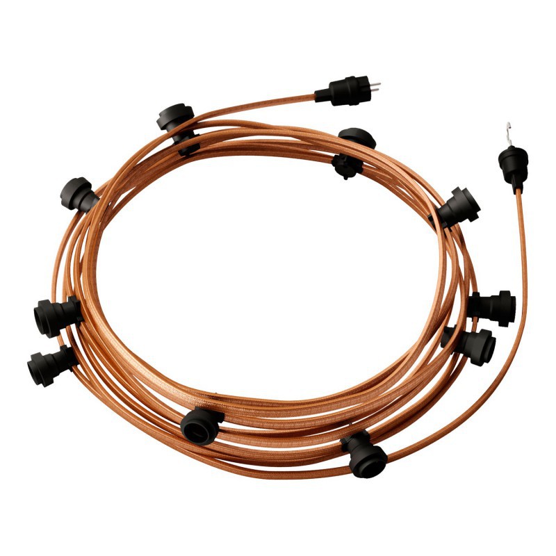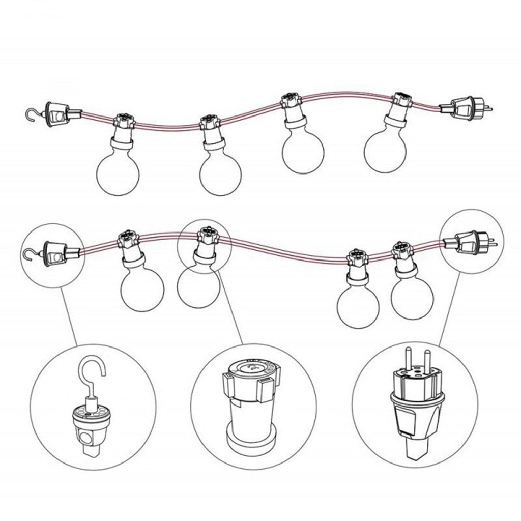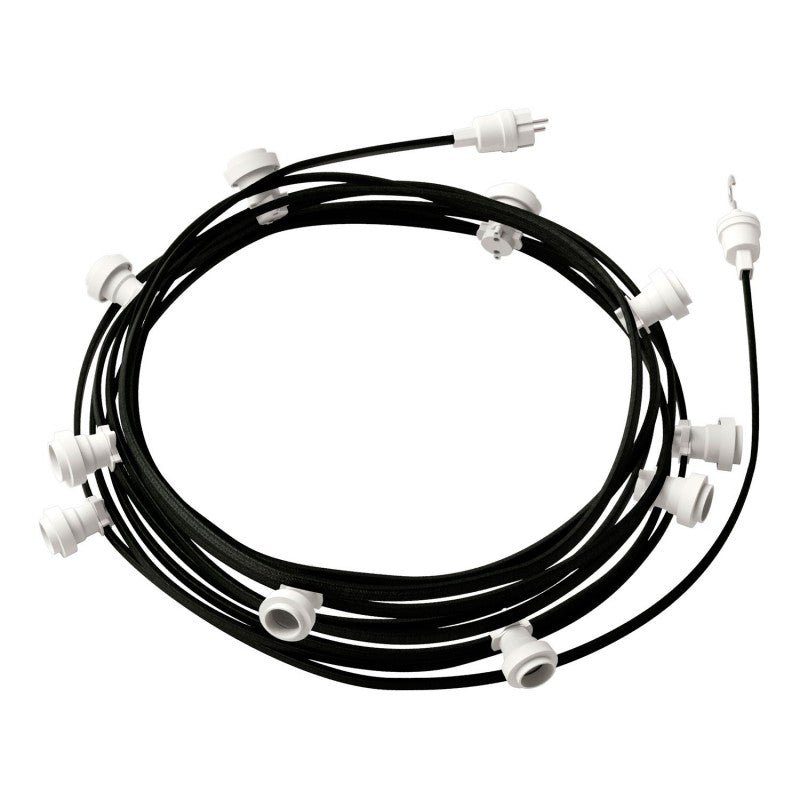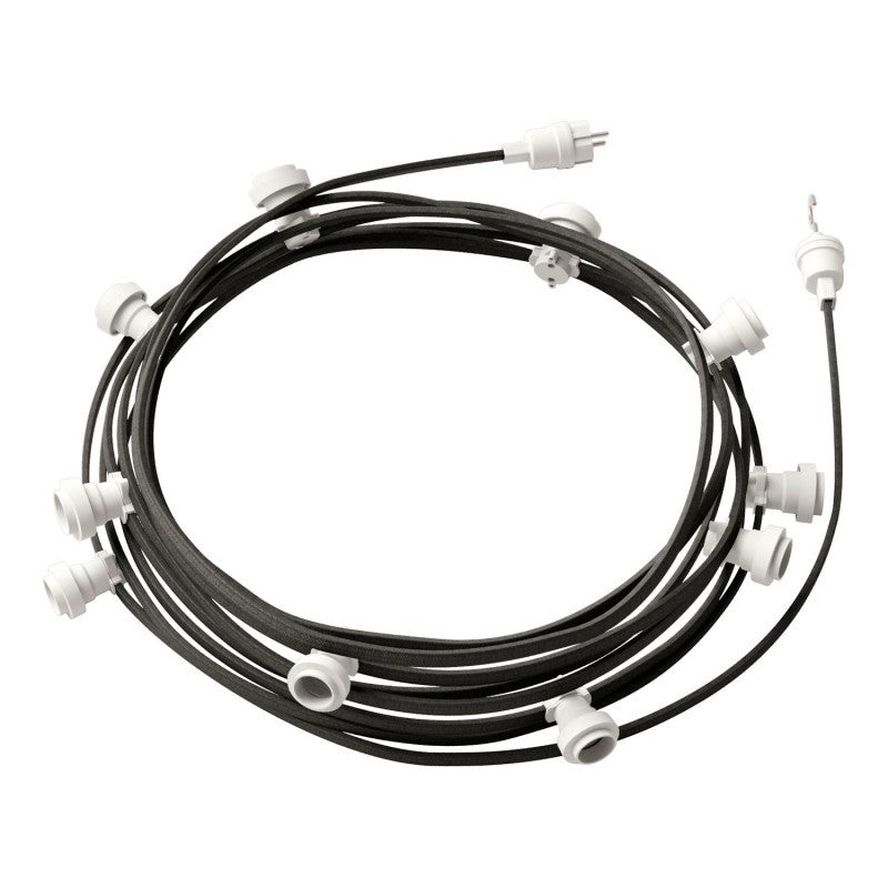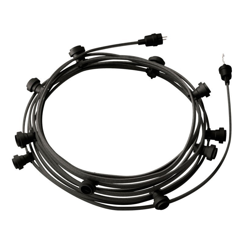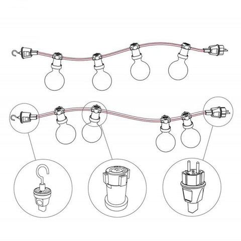 Descrição Sistema de iluminação grinalda exterior com cabo plano retangular têxtil incluindo os casquilhos E27, ficha e gancho de suporte.