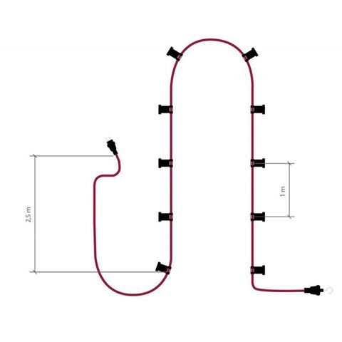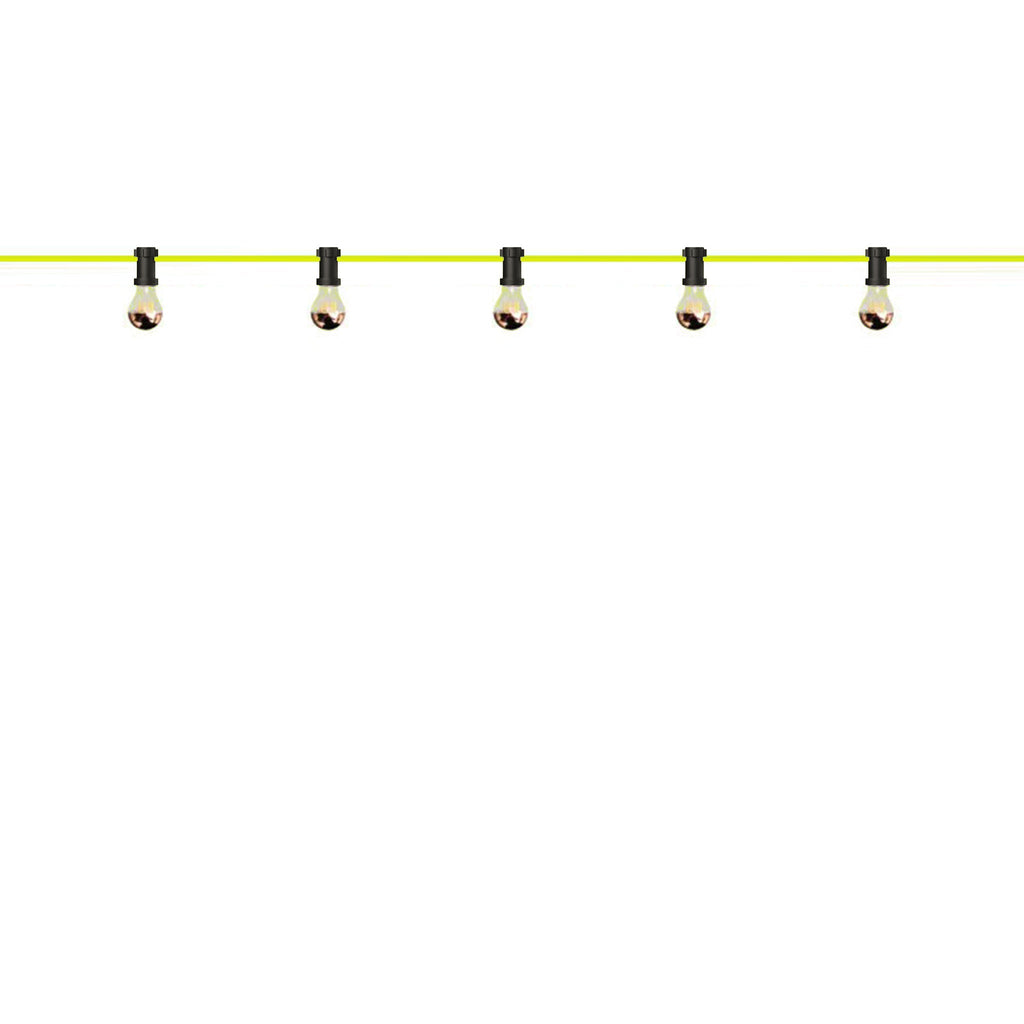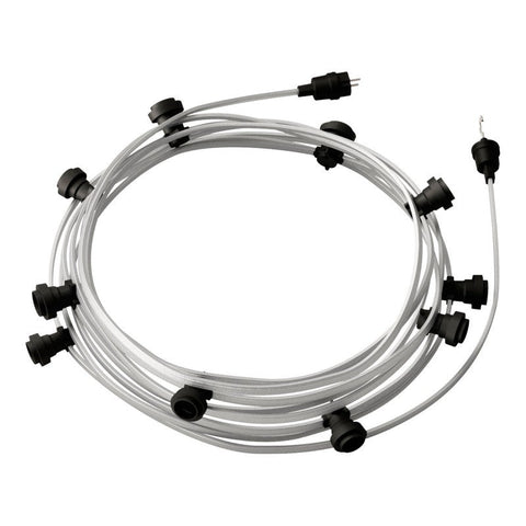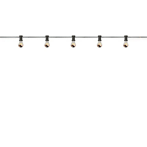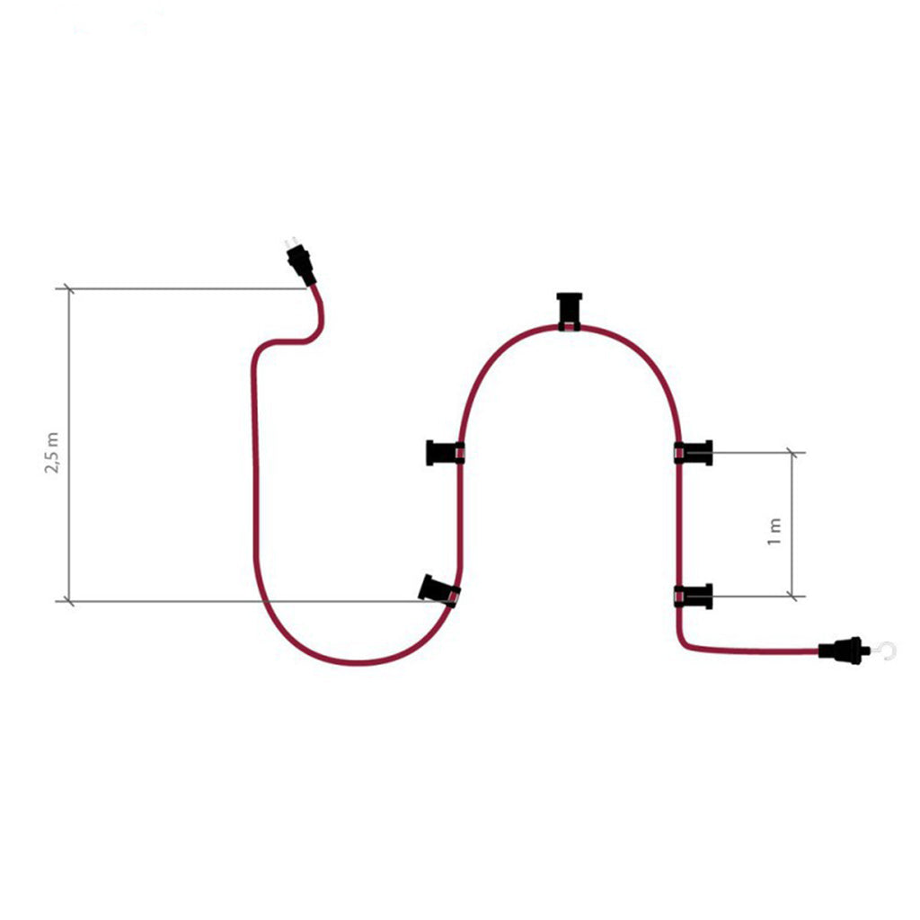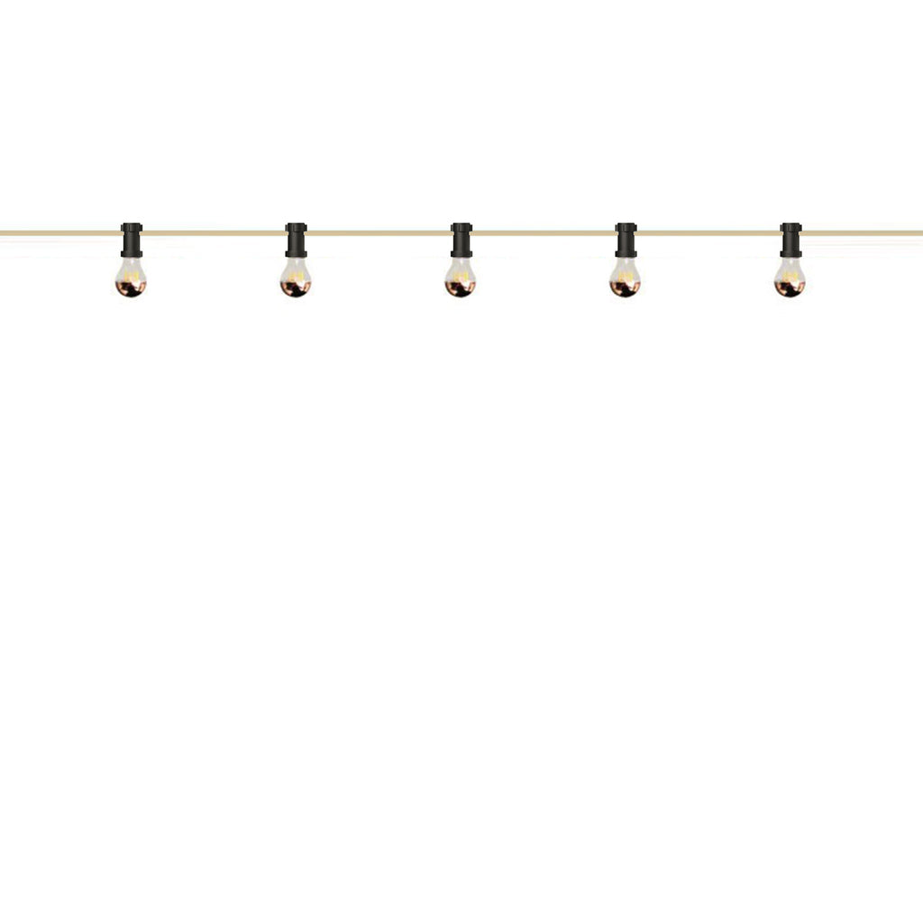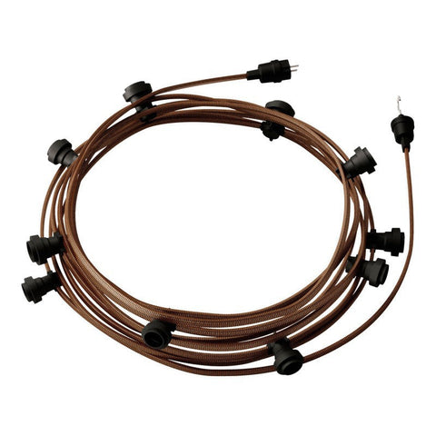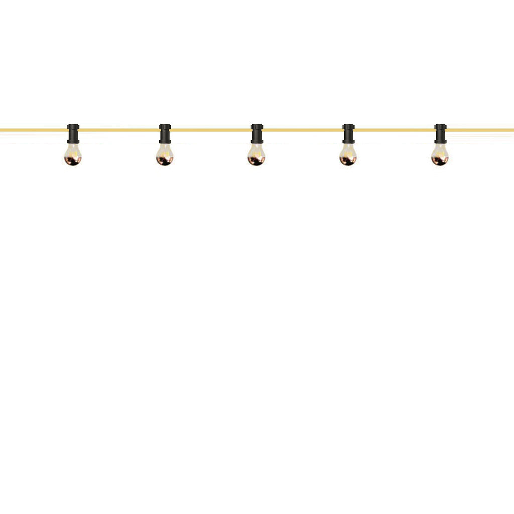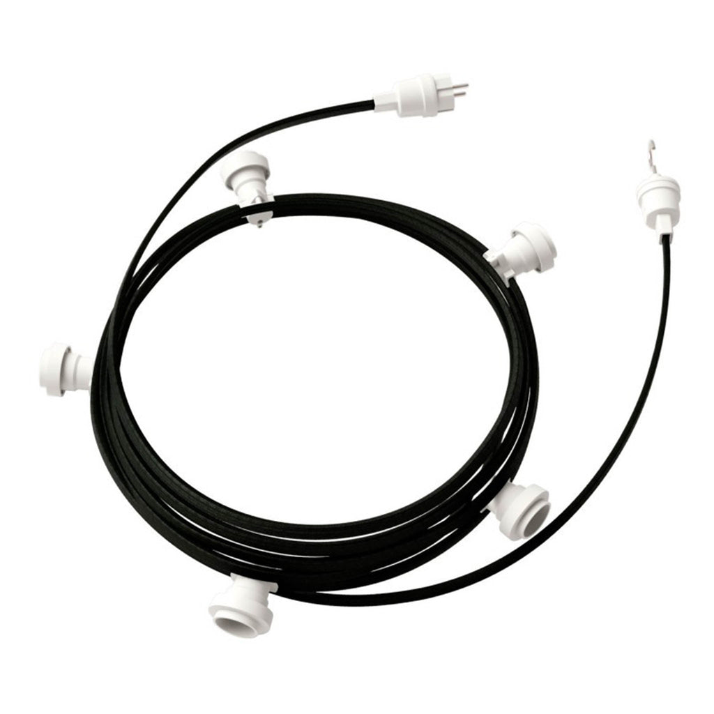 Descrição Sistema de iluminação grinalda exterior com cabo plano retangular têxtil incluindo os casquilhos E27, ficha e gancho de suporte.