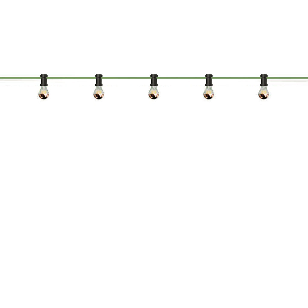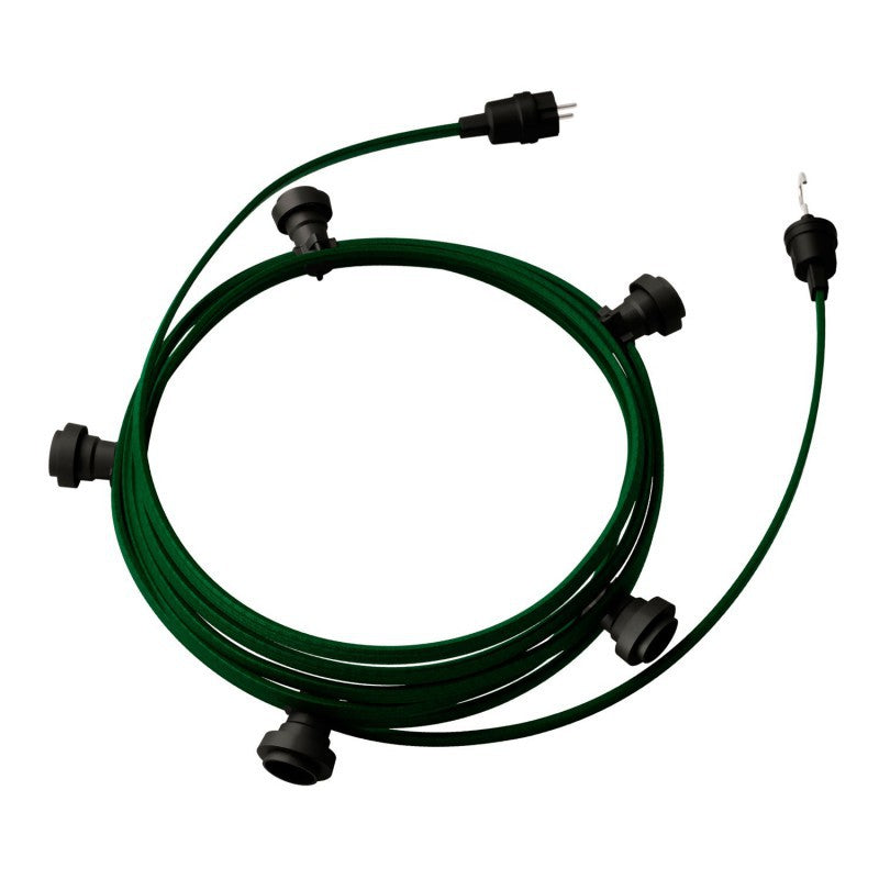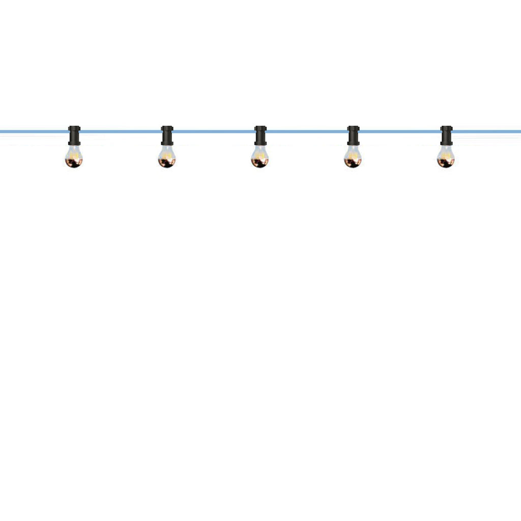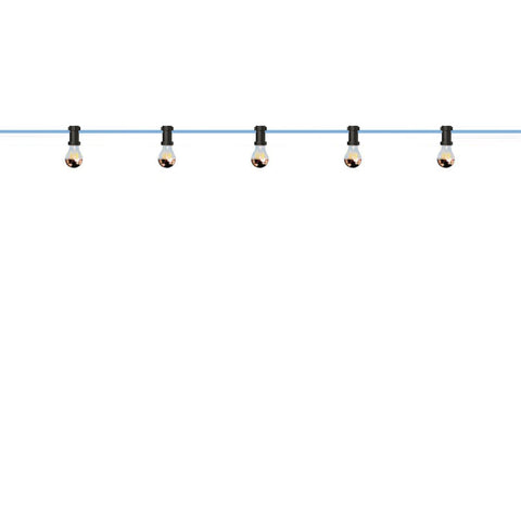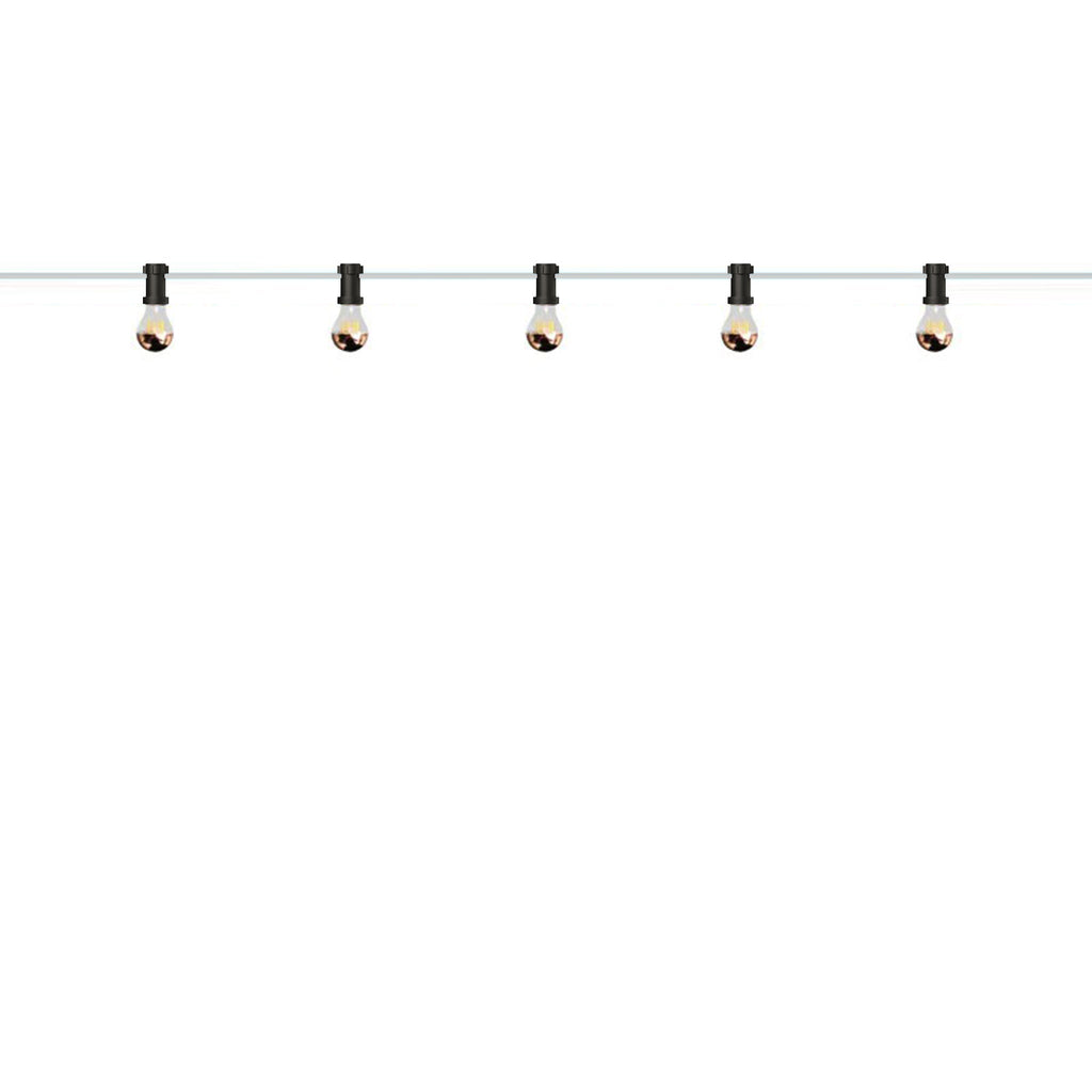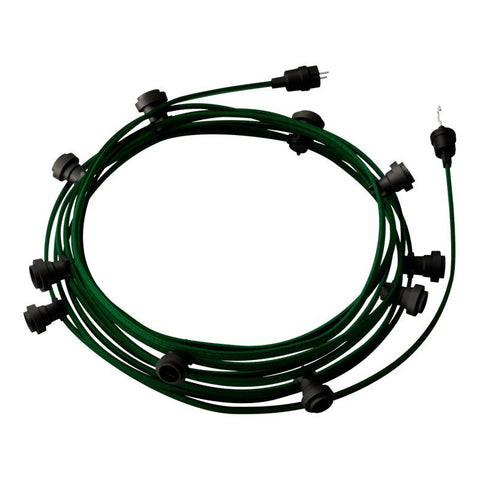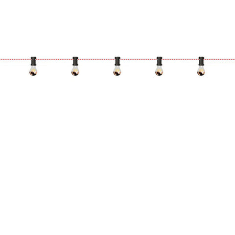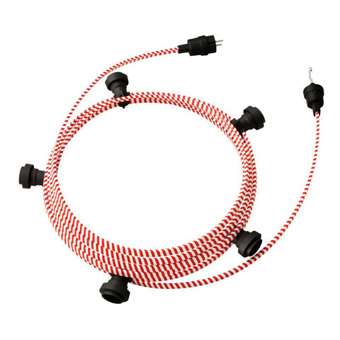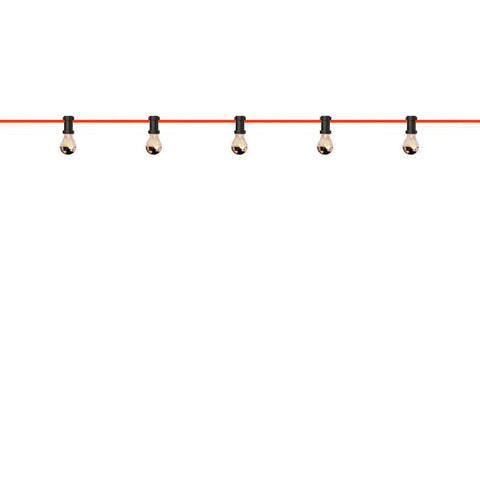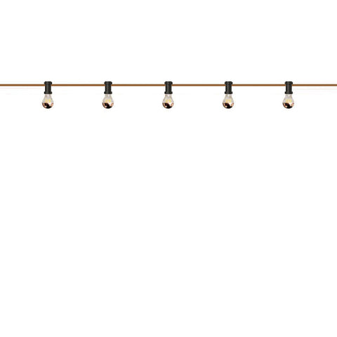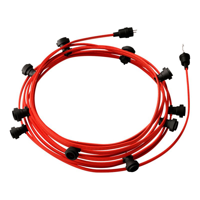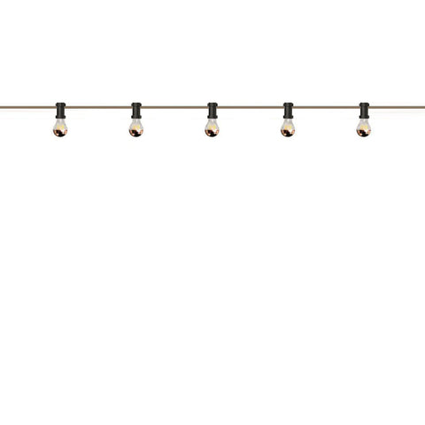 Descrição Sistema de iluminação grinalda exterior com cabo plano retangular têxtil incluindo os casquilhos E27, ficha e gancho de suporte.