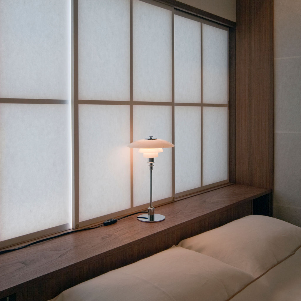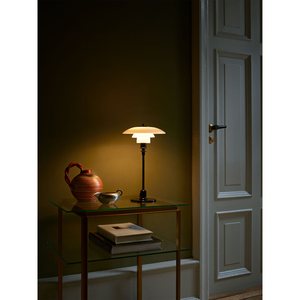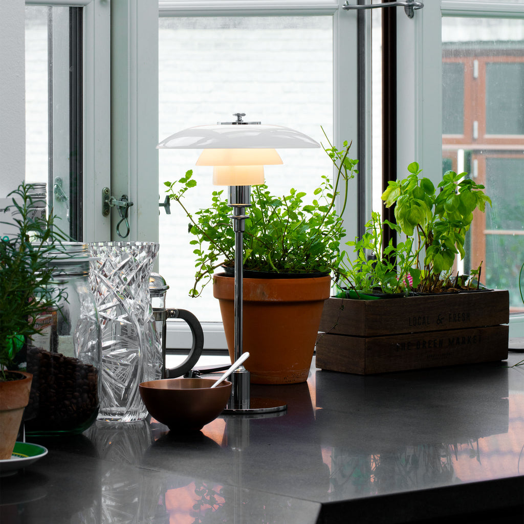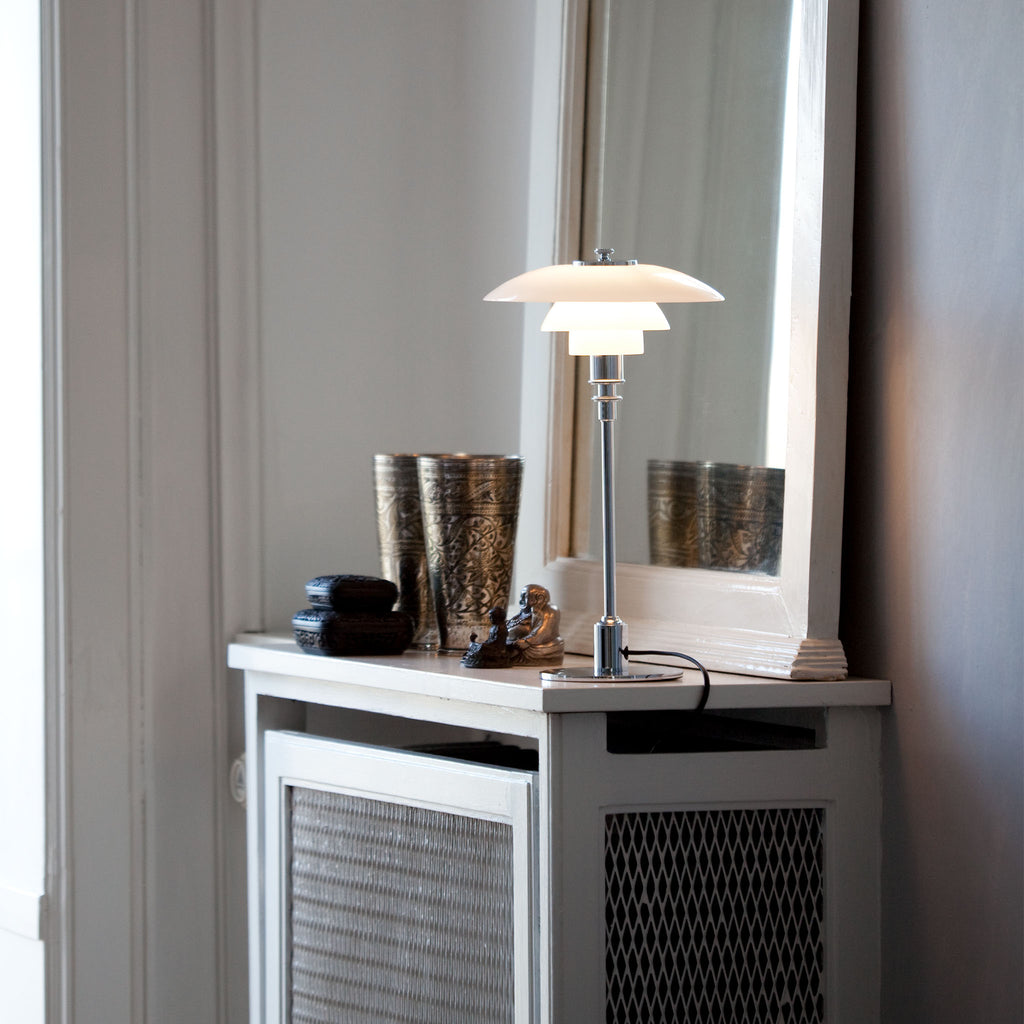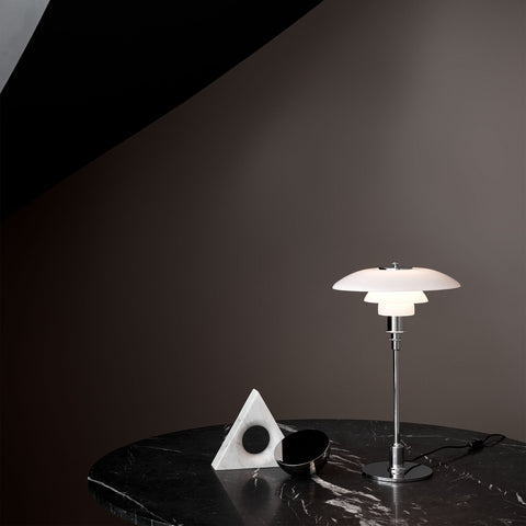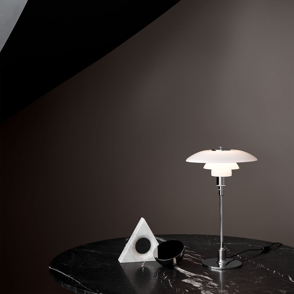 Descrição Poul Henningsen projetou o seu sistema de 3 abajures entre 1925 e 1926, primeiramente desenhadas para uma exposição em Paris. O seu trabalho com a Louis Poulsen continuou até à sua morte em 1967. Ao longo da sua vida, Henningsen procurou criar um candeeiro sem ofuscamento, direcionando a luz onde era mais necessária e criando sombras suaves.