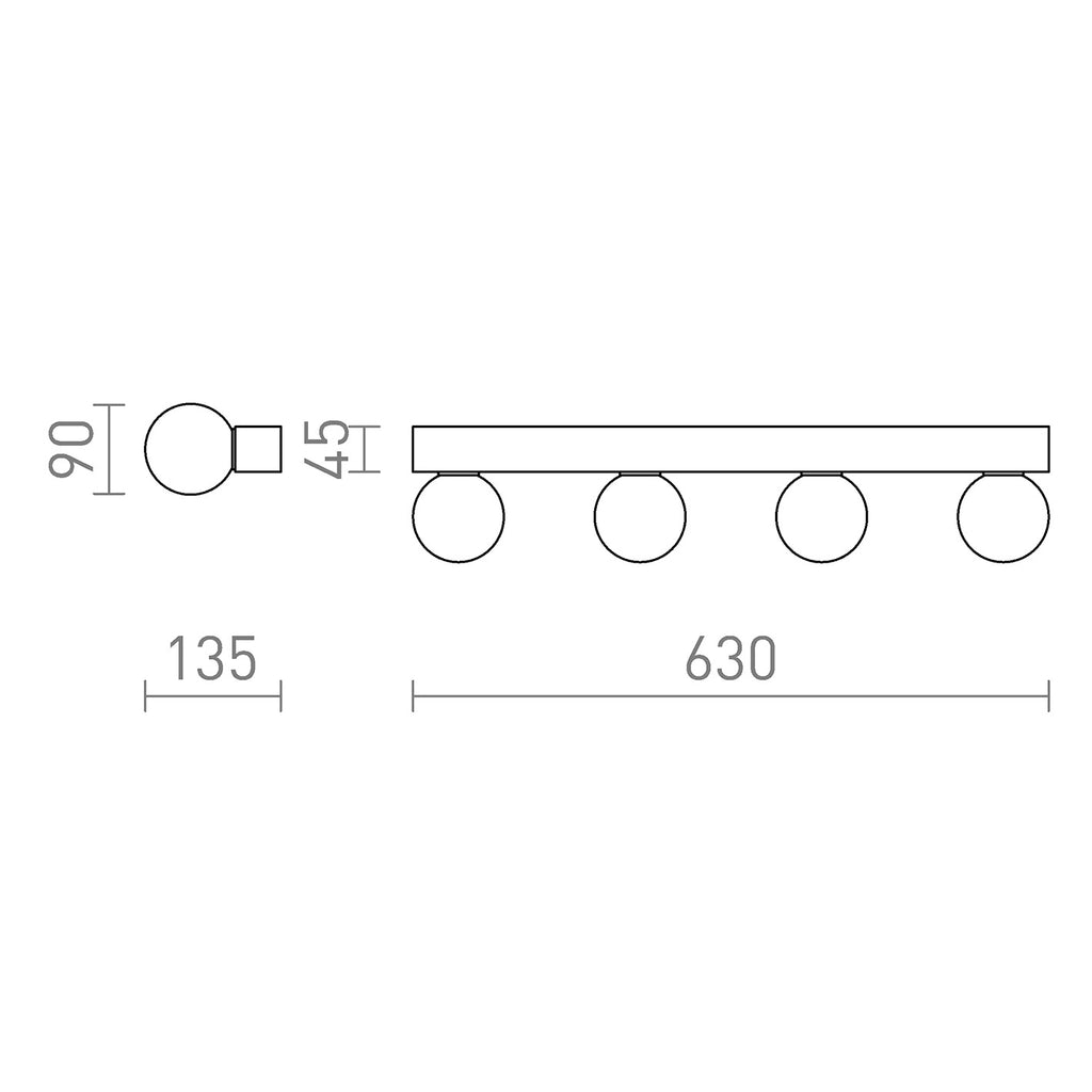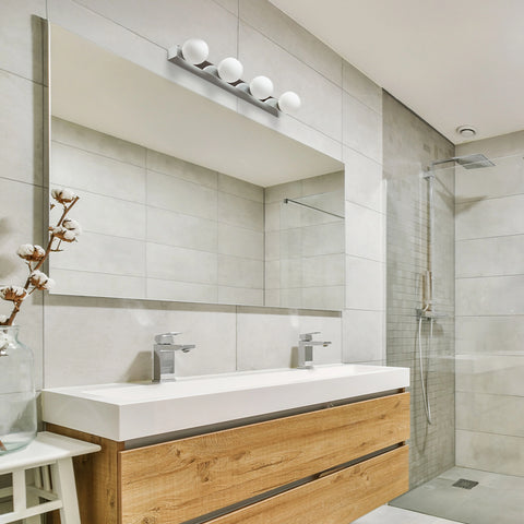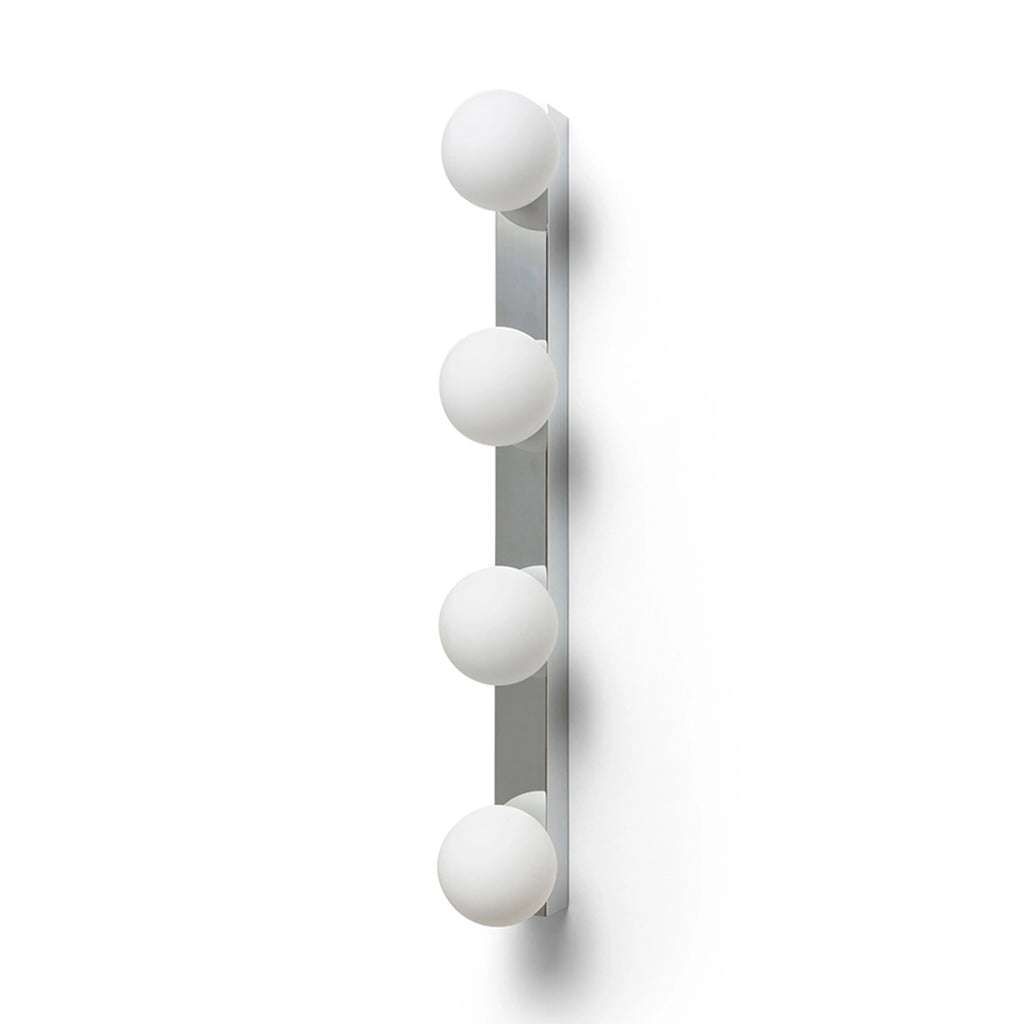 Candeeiro de parede linear para casa de banho com quatro abajures opalinos numa base cromada. Adequado para zonas húmidas IP44 |