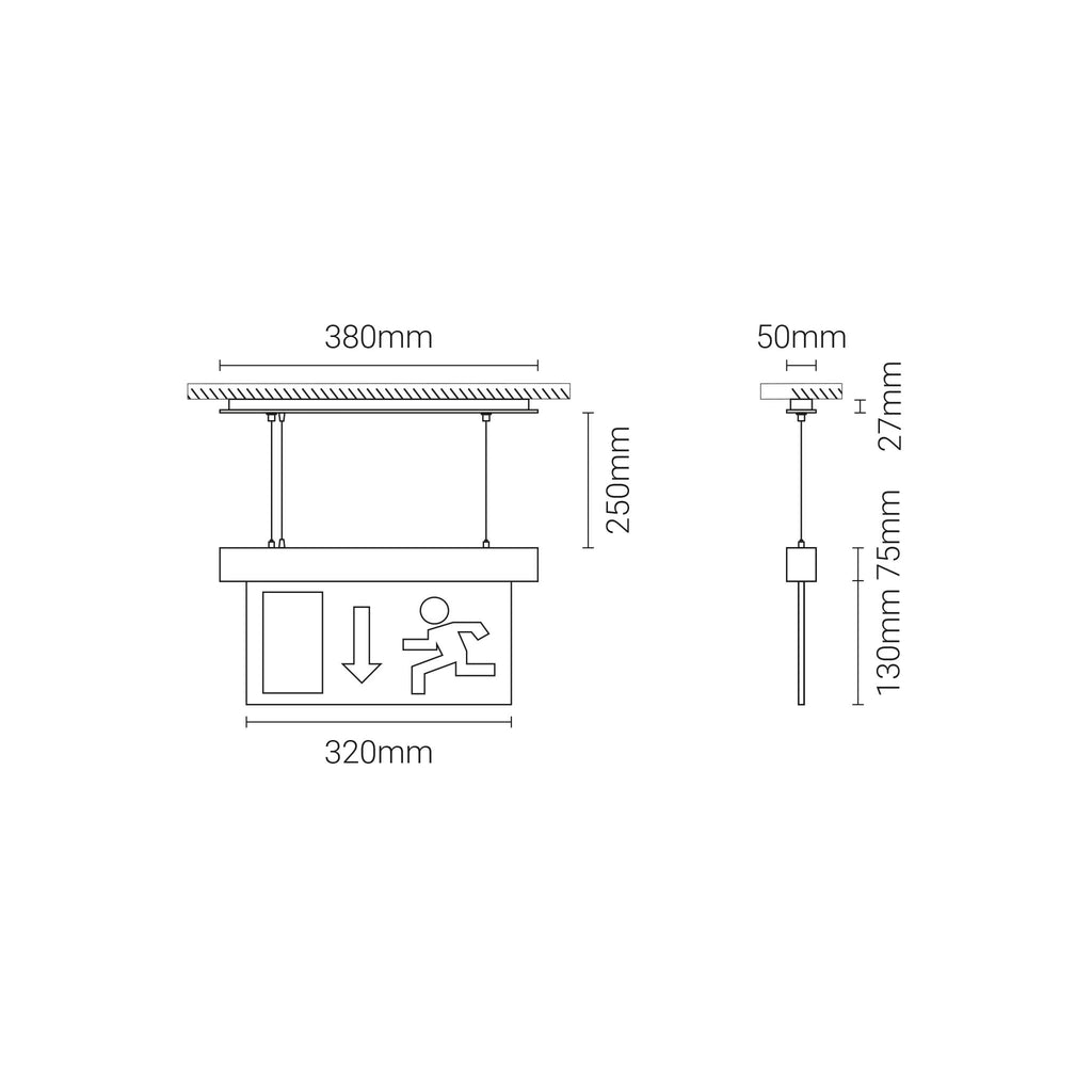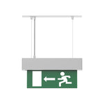 Luminária de emergência suspensa de teto, para aplicação em espaços interiores, com projeção de luz descendente. Corpo em alumínio injetado com possibilidade de pintura em diferentes acabamentos. Pictograma incluido, a definir na encomenda. |
