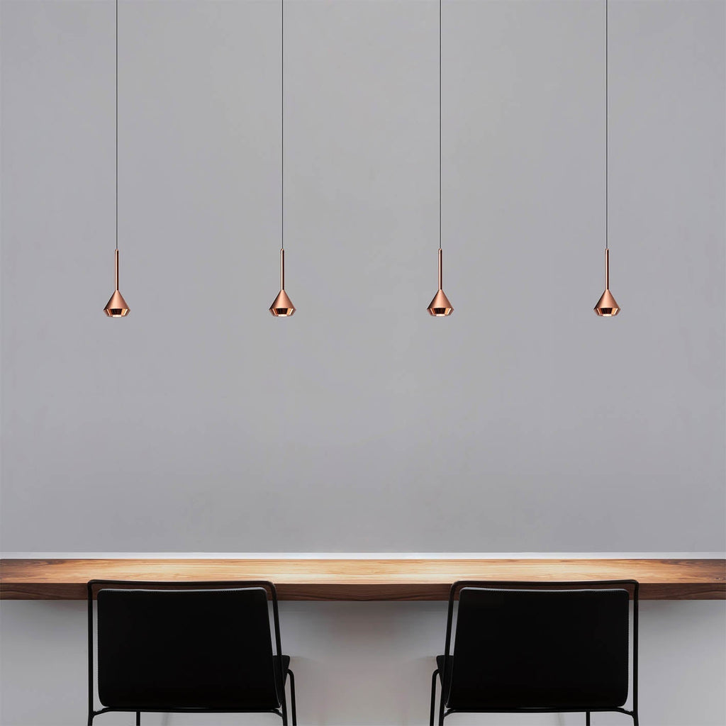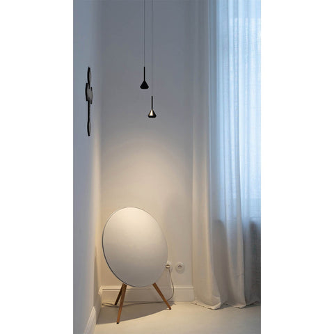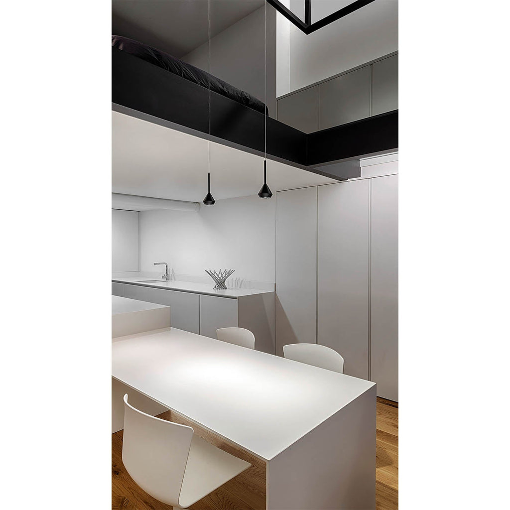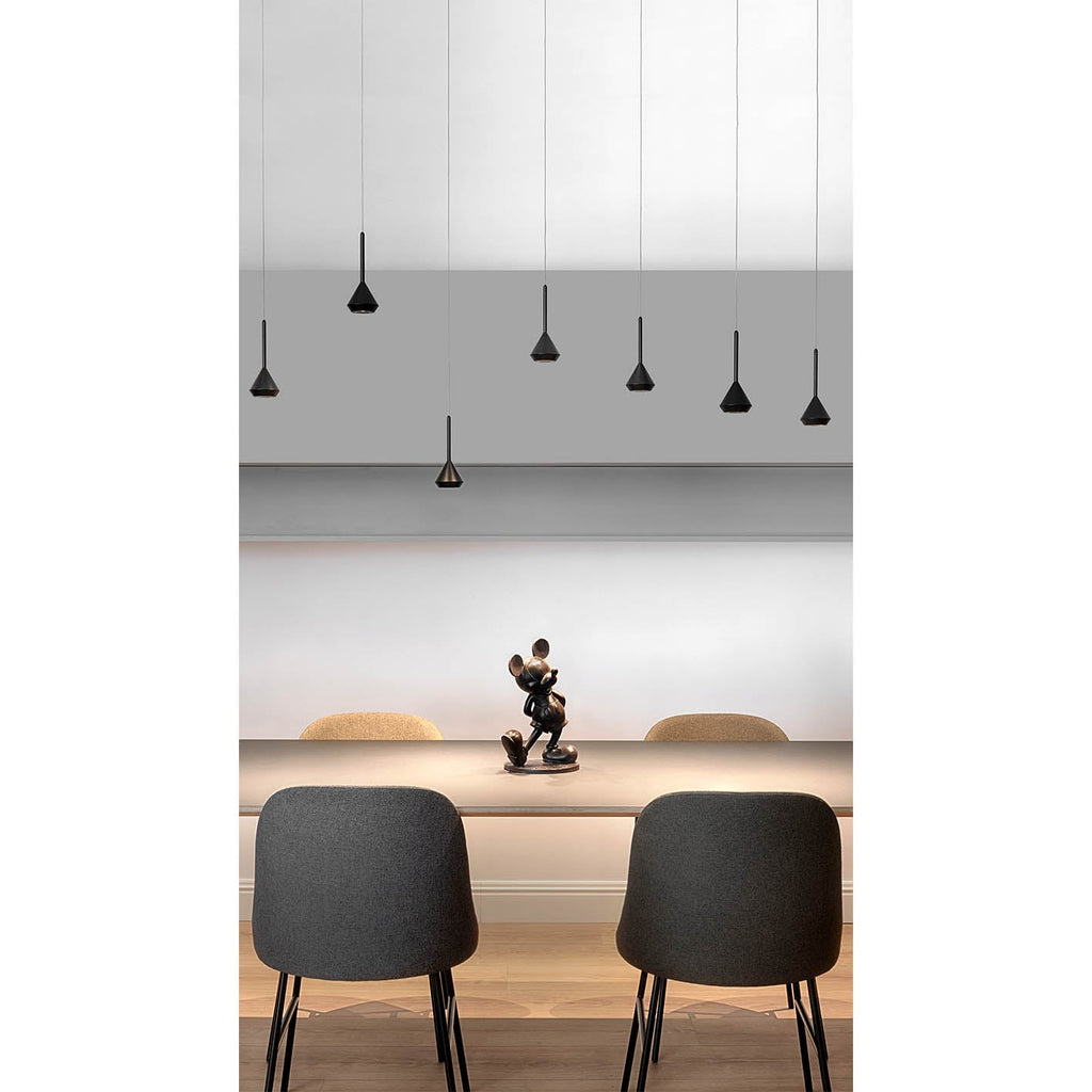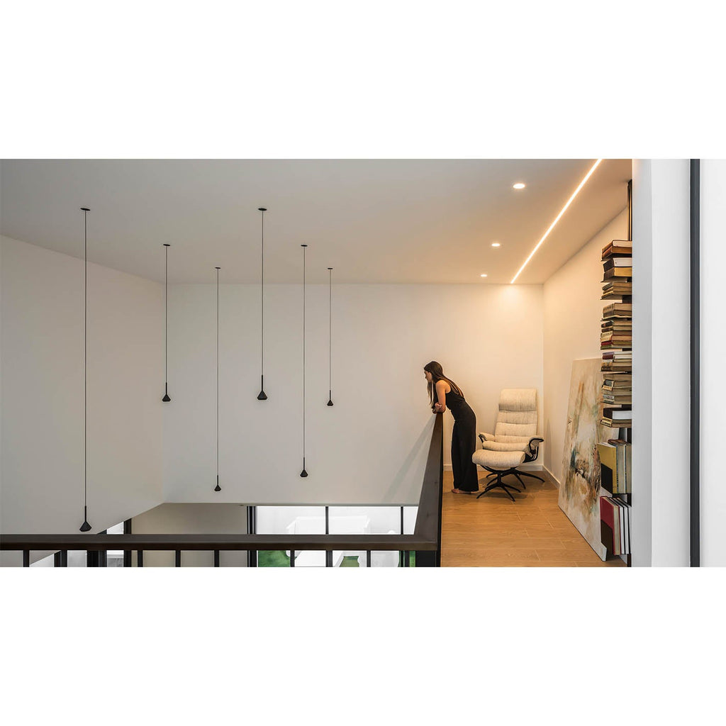Descrição Candeeiro suspenso compacto e geométrico, de linhas claras e com cabo ultra fino que transmite a sensação de flutuação aérea. Pode ser instalado individualmente ou em cluster e com copo de teto saliente ou de encastrar. Permite regular a intensidade de luz (dimável).