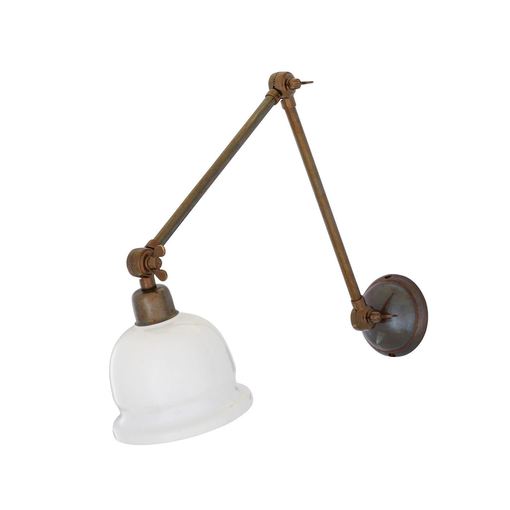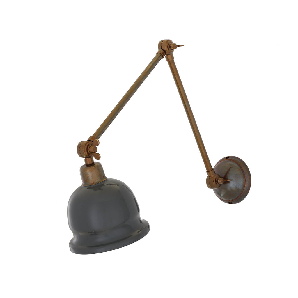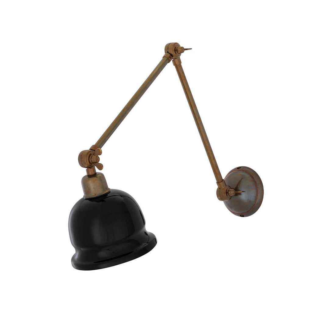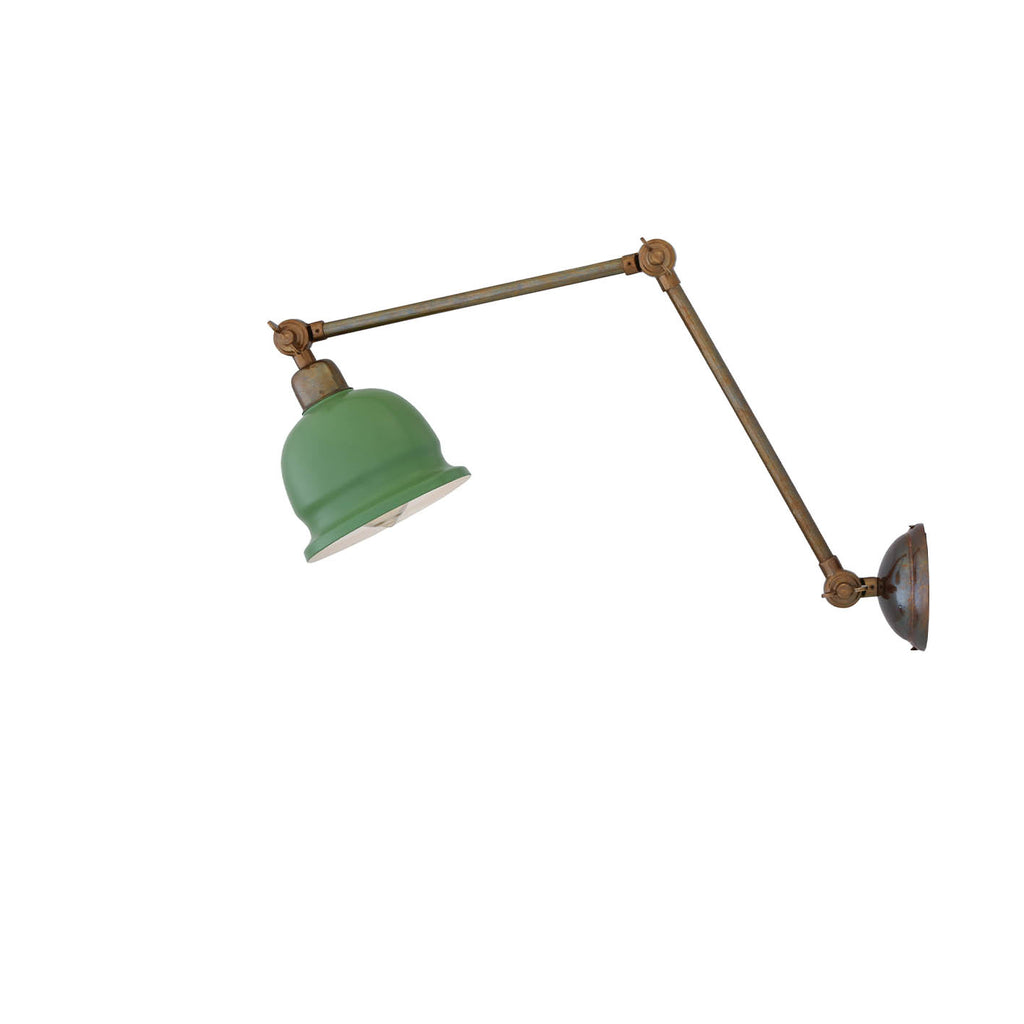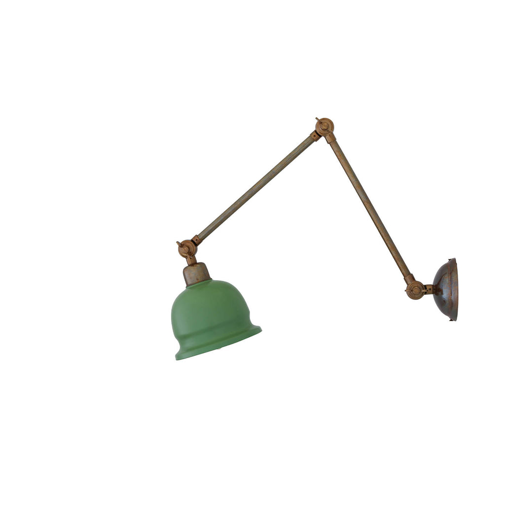 Na extremidade do braço ajustável, há um abajur simples em forma de chapéu curvo em latão com acabamento em pintura eletrostática.