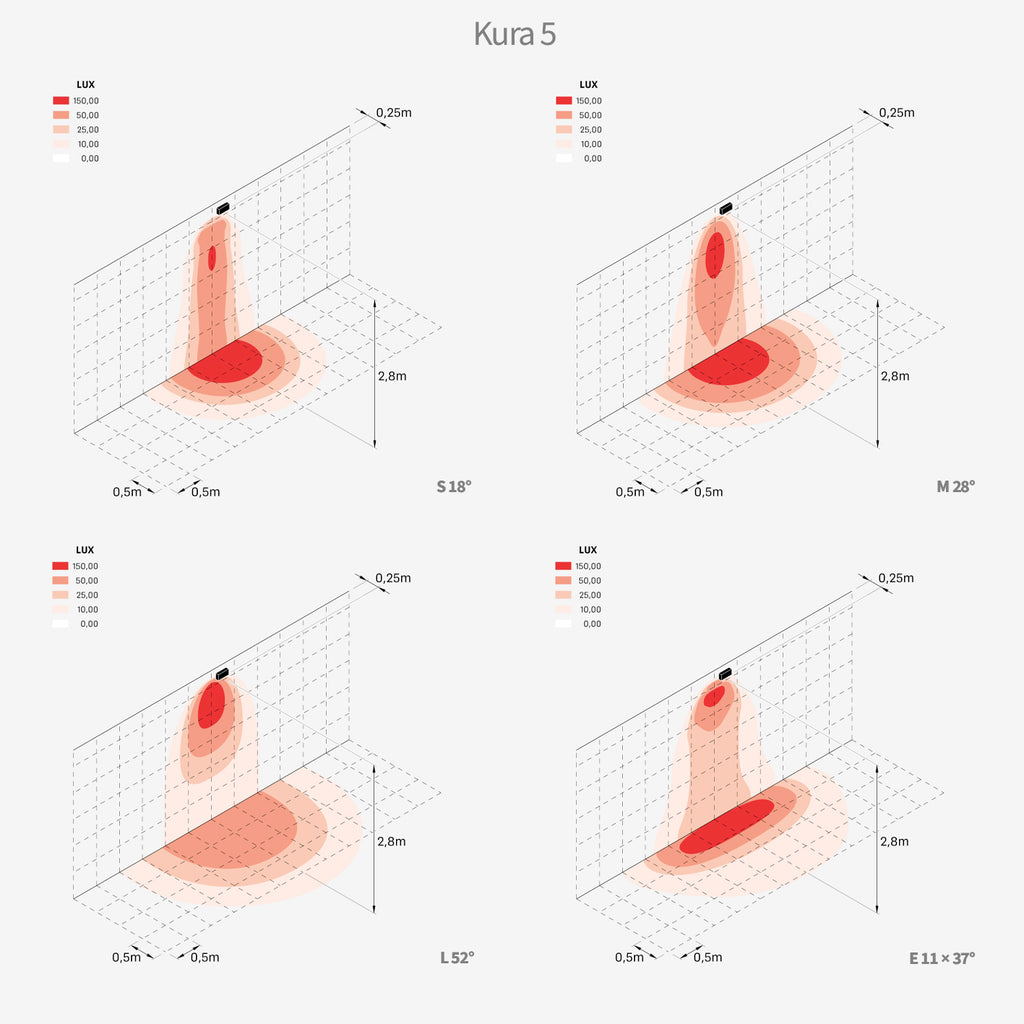 | Ângulo de abertura * | S 18° / M 28° / L 52° / E 11 x 37º |