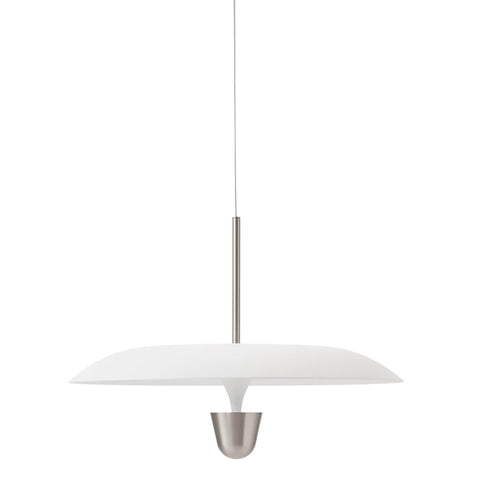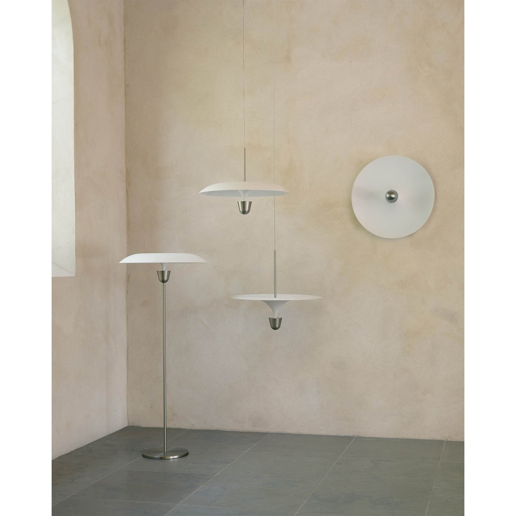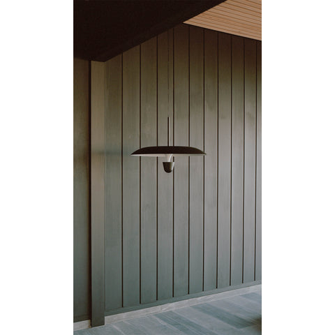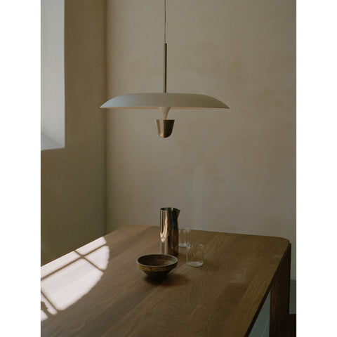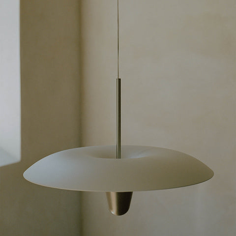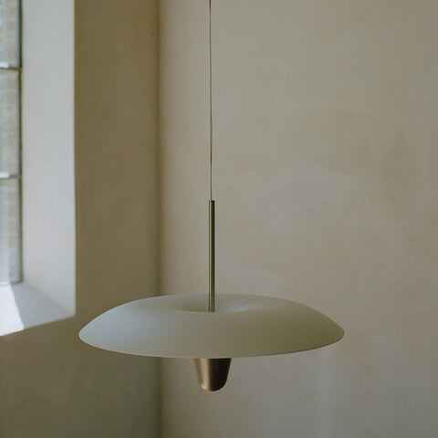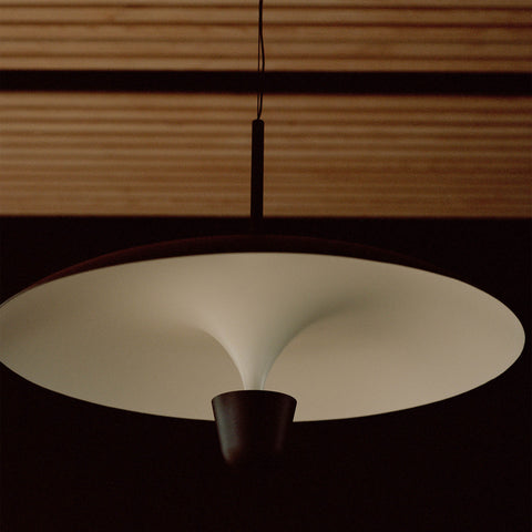 A silhueta elegante e gráfica criada entre os dois círculos concêntricos - o abajur e o refletor - atrai instantaneamente o olhar. Permite diferentes opções de montagem — alta ou baixa — revelando vários aspetos da sua forma poeticamente fluida, desde a parte inferior abobadada até ao topo suave. Com qualquer ponto de vista, o candeeiro suspenso Kantarell cria uma adição escultural ao espaço.