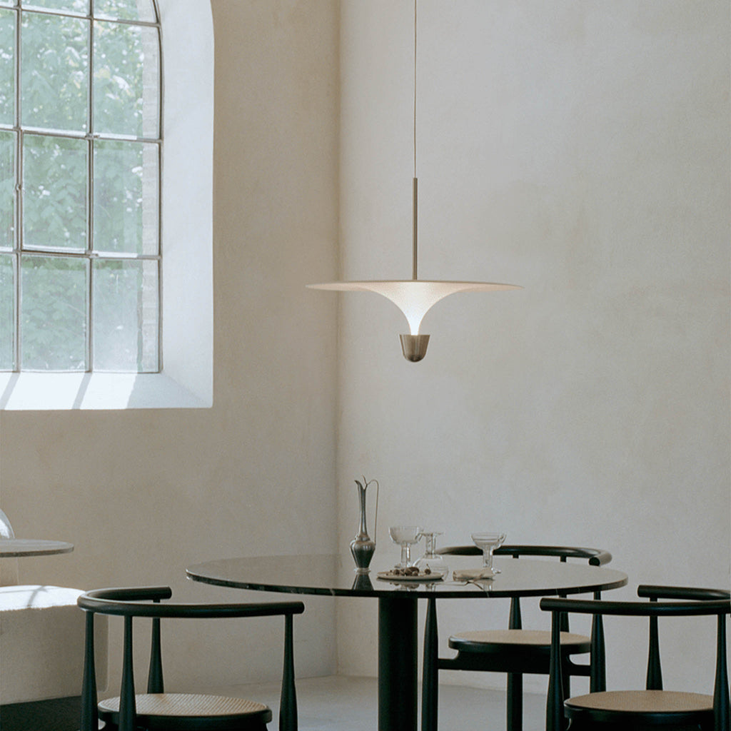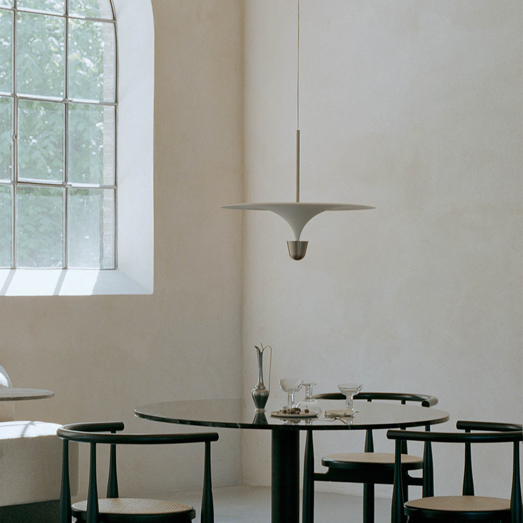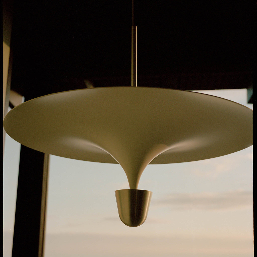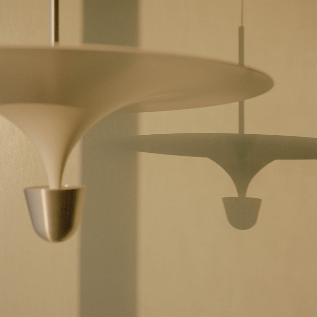 A ideia da série Kantarell surgiu de um estudo sobre a forma de direccionar a luz. Com a formato entre um trompete e um funil, Kantarell espalha a luz a partir de uma fonte quase oculta no seu centro. A silhueta elegante e gráfica criada entre os dois círculos concêntricos - o abajur e o refletor - atrai instantaneamente o olhar. Permite diferentes opções de montagem — alta ou baixa — revelando vários aspetos da sua forma poeticamente fluida, desde a parte inferior abobadada até ao topo suave. Com qualquer ponto de vista, o candeeiro suspenso Kantarell cria uma adição escultural ao espaço. Design by Falke Svatun |