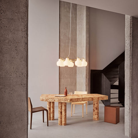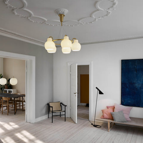| Descrição | A família VL Ring Crown deriva de um candeeiro concebido pelo arquiteto Vilhelm Lauritzen para a Casa da Rádio Dinamarquesa, em Copenhaga, na década de 1940. Com a sua forma orgânica caraterística, o candeeiro é feito de latão polido não tratado e com três, cinco ou sete abajures em vidro opalino soprado, que acrescenta um toque distinto e autêntico a interiores elegantes, bem como uma luz quente para iluminar suavemente a vida contemporânea. Design by Vilhelm Lauritzen - Louis Poulsen |