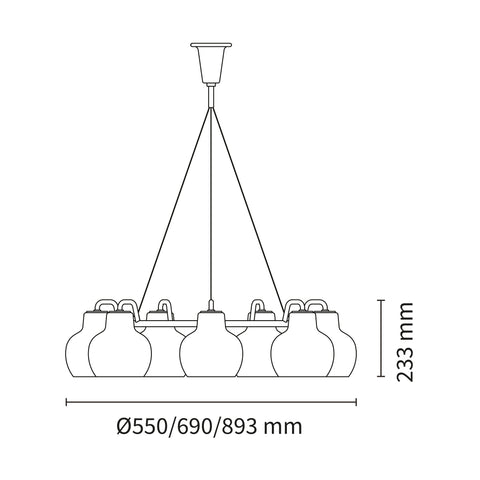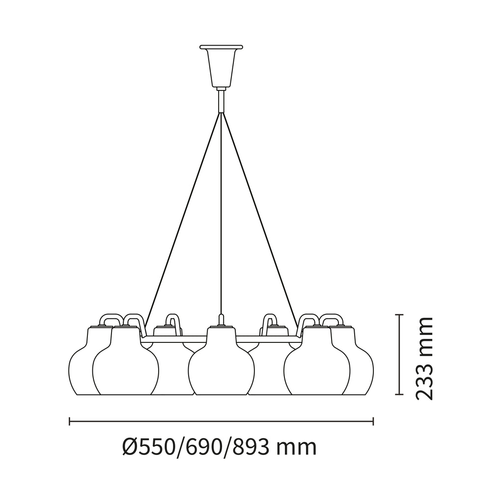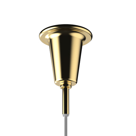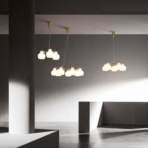 | Materiais | Abajur em vidro opalino soprado e brilhante, com 3 camadas. Cabos em aço inoxidável. Estrutura e copo de teto em latão polido acetinado, não tratado, que patina. |
