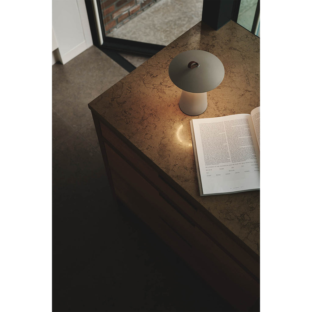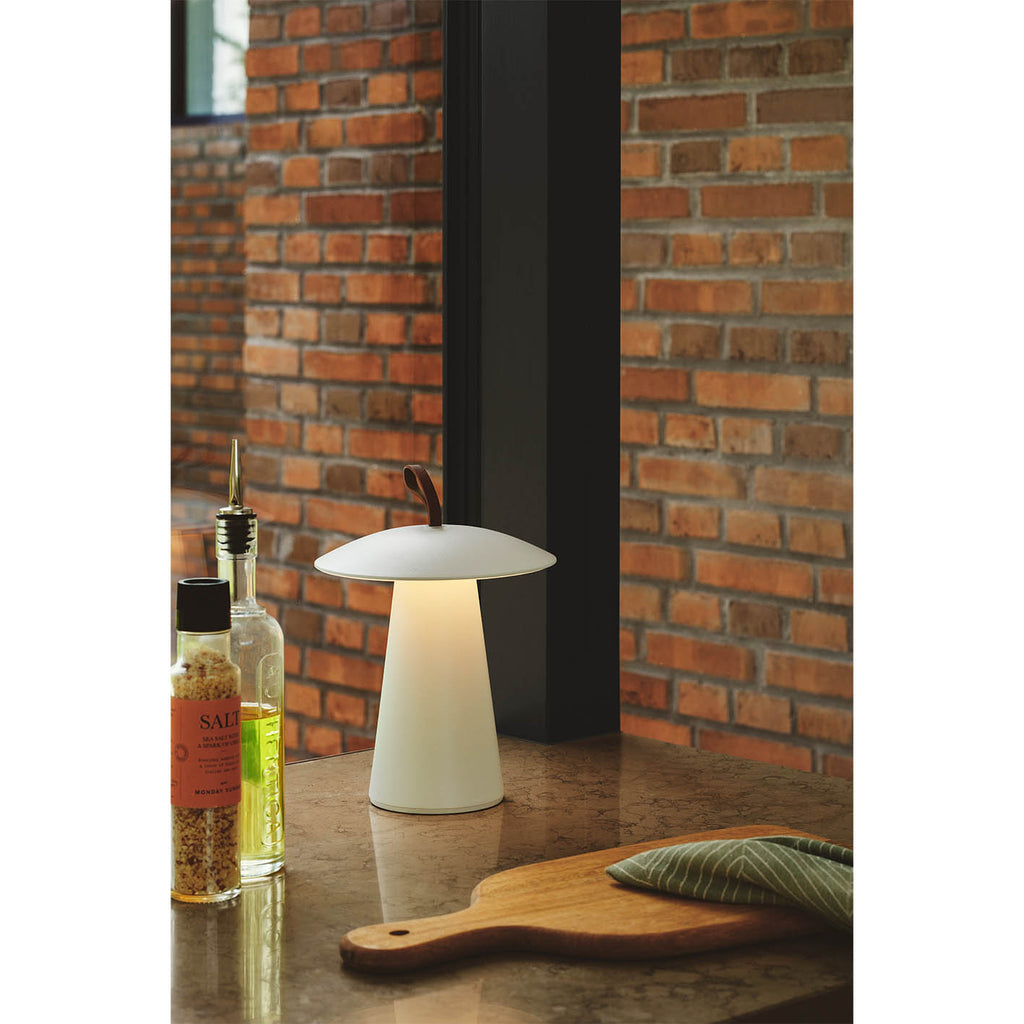 Descrição Ara to go é um candeeiro de mesa portátil e de pequenas dimensões. Possui um design com forma cónica, e é fácil de transportar graças à alça em couro.