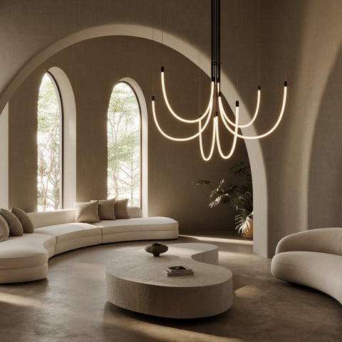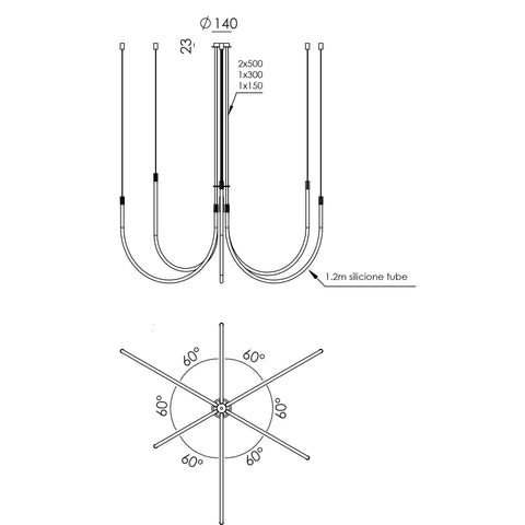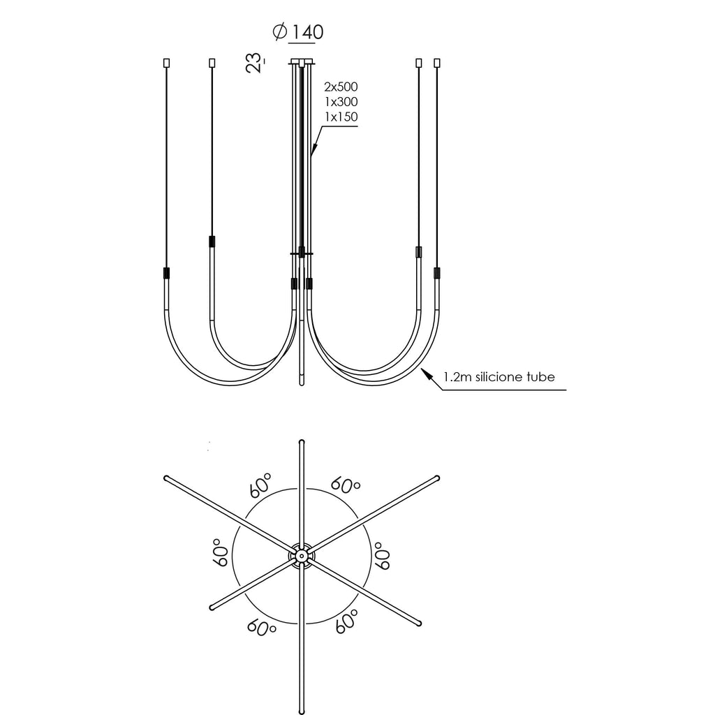 Na instalação é possível definir a altura ao teto do candeeiro e a localização no teto dos fixadores dos 6 tubos LED de silicone, permintido criar um candeeiro lustre único e personalizado.