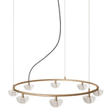 | Descrição | Candeeiro suspenso tipo lustre chandelier composto por estrutura circular em dourado com focos em vidro listrado. |