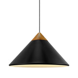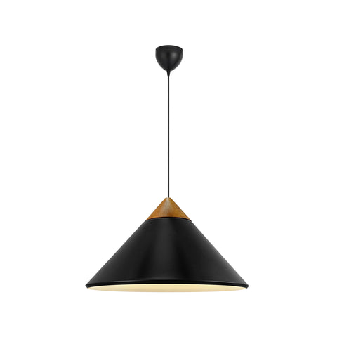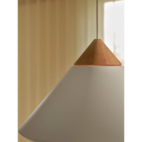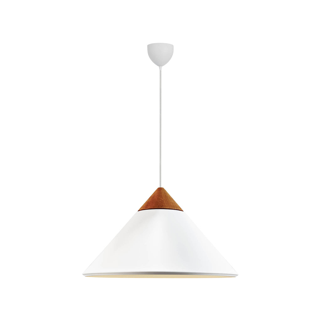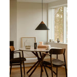 Candeeiro suspenso de design minimalista escandinavo Com abajur de metal em forma de cone, elegante topo em madeira escura e pormenores em latão polido. A luz é emitida suavemente através da abertura no topo do abajur, criando um belo efeito. É perfeito para mesa de jantar ou para a bancada da cozinha. Design by Bjørn+Balle |