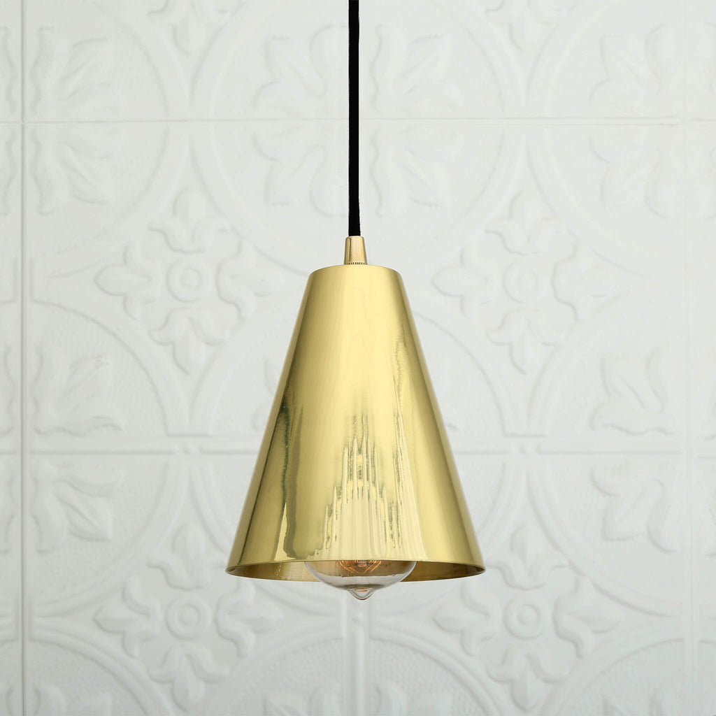 Descrição Candeeiro suspenso de forma cónica em metal.