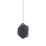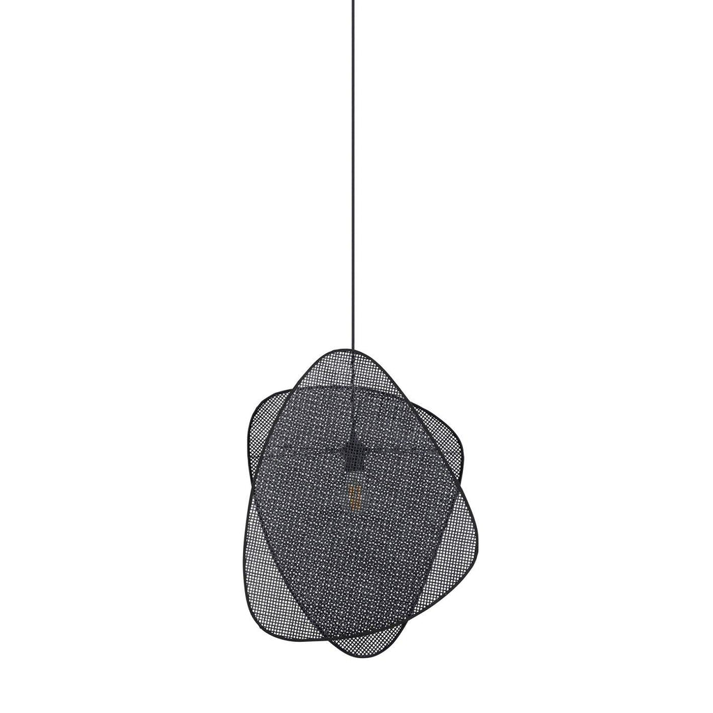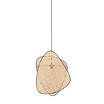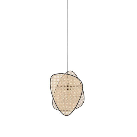 Descrição Candeeiro suspenso de acabamento natural. Composto por uma estrutura em metal pintada e com abajur tipo tela em rattan ou em papel murano.